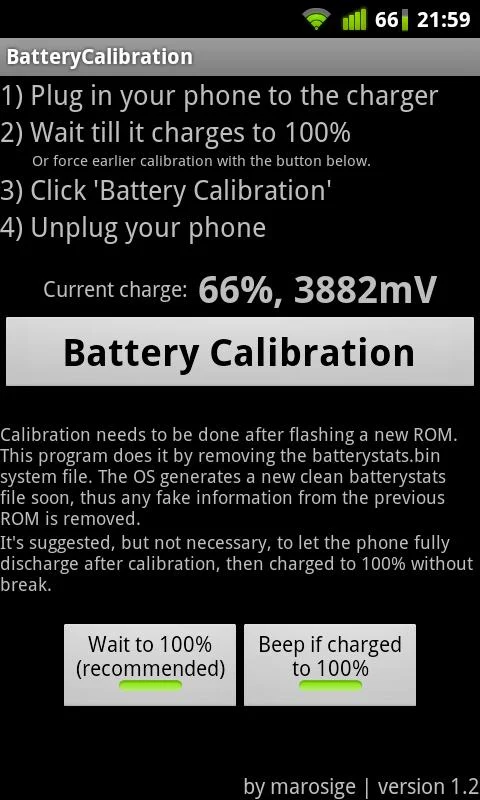 هدا التطبيق رائع حيث يمكنه من ارجاع البطارية كانها جديدة لان هدا التطبيق يمحي كل الملفات الموجودة في البطارية والتي لا يمكننا رايتها,لا خوف على البطارية وهده الطريقة تجعل البطارية تدوم فترة اطول اذكركم ان عليكم شحن البطارية مئة في المئة ثم الضغط على كلمة"battery calibration"كما مبين في الصورة اعلاه
